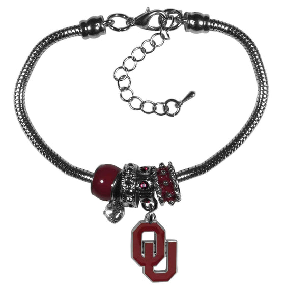 Discover the perfect way to showcase your team spirit with our Oklahoma Sooners Euro Bead Bracelet, a must-have sports gift for every dedicated fan. This officially licensed college product features a stylish 7.5-inch snake chain with a 2-inch extender, designed to fit comfortably while making a statement. Adorned with four vibrant Euro beads in enameled team colors, this bracelet also boasts stunning rhinestone accents and a high-polish nickel-free charm.