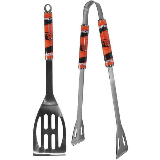 Elevate your game day experience with our premium stainless steel 2-piece BBQ set, an essential for any sports fan. Featuring vibrant, large team graphics, this officially licensed Oregon State Beavers BBQ set highlights your team spirit while grilling. Perfect for tailgating or backyard barbecues, this set includes a spatula and tongs, each proudly displaying the Oregon State Beavers emblem.