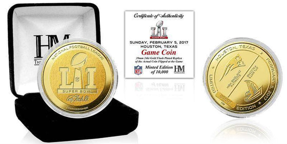 The Highland Mint is proud to present the gold flashed Super Bowl 51 Flip Coin! This is a gold flashed replica of the coin used on the field to start the game! Featured on the front is the dueling AFC & NFC team logos, date and location of the game. The back of the coin is struck with the official Super Bowl 51 commemorative logo. Each 1.5” inch diameter flip coin is individually numbered and protected in an acrylic capsule to preserve its condition and presented in a custom 2.5"x 2.5" jewelry case along with a certificate of authenticity. A limited mintage of only 10,000 and officially licensed by the NFL. Proudly made in the U.S.A. by The Highland Mint!