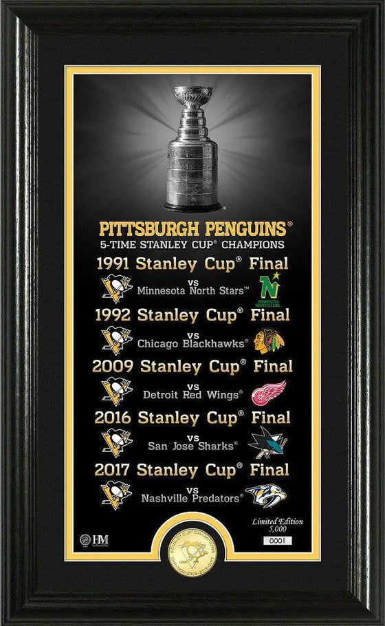 A limited edition commemorating the 5-time Stanley Cup Champion Pittsburgh Penguins! This 12”x 20” Frame with double matting and a glass front panel features a custom and individually numbered 15” x 7” commemorative photo listing each of their Stanley Cups and a minted 39mm solid bronze 5-time Stanley Cup Champions coin. A limited edition of only 5000, each Photo is hand numbered and each frame is accompanied by a certificate of authenticity. This item is officially licensed by the NHL and proudly made in the U.S.A. by The Highland Mint.