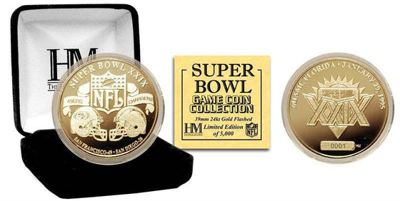 The Highland Mint is exclusively commissioned by the NFL to mint the 24KT Gold Super Bowl XXIX Game Coin! Each 24KT Gold flashed Super Bowl Flip Coin is a replica of the coin used for the Super Bowl "Coin Toss" and each is triple struck to the highest standards in minting tradition. This is the only coin licensed to feature the prestigious Vince Lombardi Trophy and it features the dueling helmets of the Super Bowl teams on either side! The reverse of the Flip Coin features the Official Super Bowl XXIX logo with the location and date of the game listed on the perimeter. Furthermore each coin is individually numbered on giving each coin its uniqueness! The coin measures 1.5” in diameter and each is protected in a capsule to preserve its condition and delivered in a 2.5" x 2.5" black velour collectors box with a Certificate of Authenticity. This unique Collectible is a LIMITED EDITION of only 5,000 and it is Officially Licensed by the NFL. Proudly made in the USA by The Highland Mint!