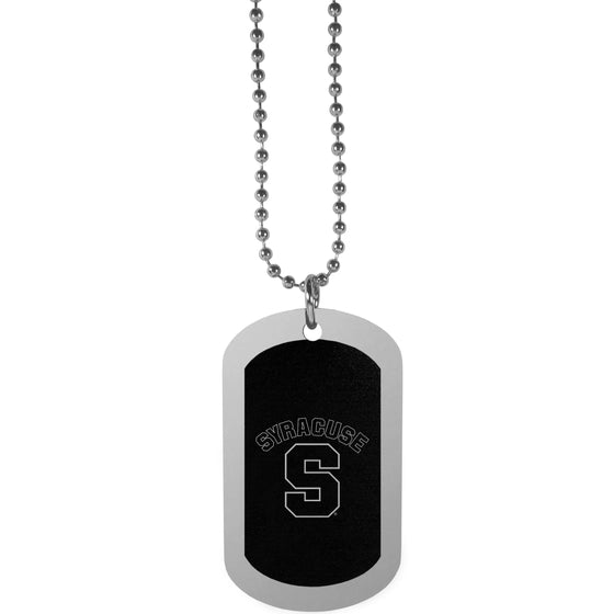 Explore our stylish Dog Tag Necklace, a must-have fashion accessory for any sports fan! This sporty version combines a sleek black print over a high-polish tag, creating a bold and dynamic look that resonates with Syracuse Orange supporters. Featuring a comfortable 26-inch ball chain with a secure ball and joint clasp, this classic dog tag style necklace is officially licensed and crafted by Siskiyou Gifts.
