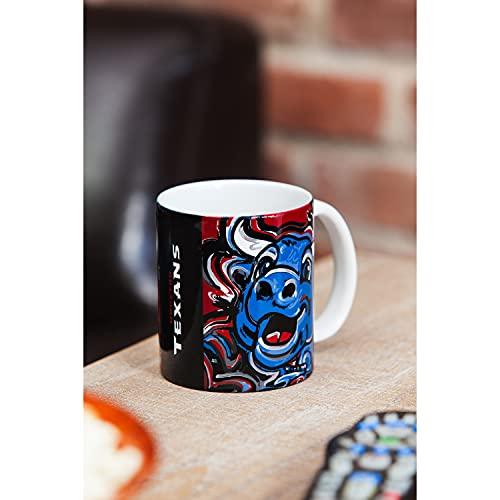 - This ceramic white mug features beautiful exclusive artwork by painter Justin Patten, showcasing a whimsical take on the mascot trend for a more artisan look