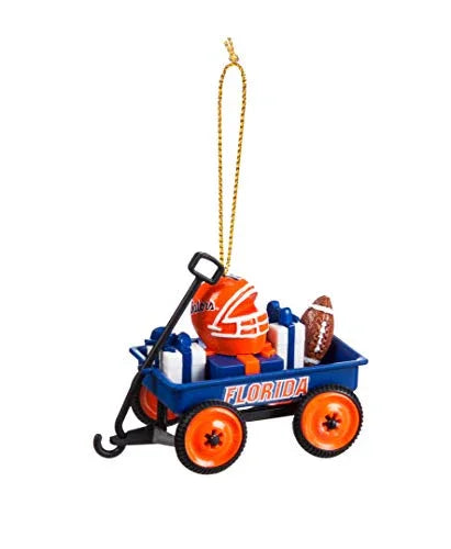 Details: Cheer on your team this holiday season with thisaddition to our whimiscal line of ornaments. This unique ornament features your favorite team themed gifts and sports equipment all loaded up in a cute wagon ready to roll to any fan. Molded from plastic with hand painted details and team logo decals. This ornament includes a ribbon for hanging and measures approximately 3.13 x 1.75 x 2.5 inches.