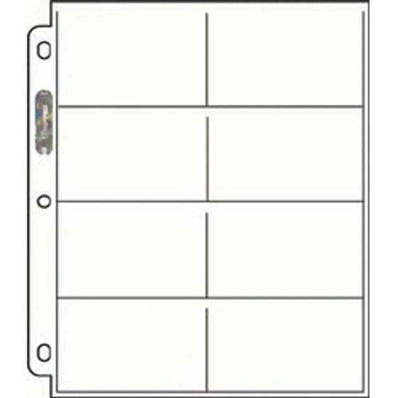 Ultra PRO Platinum Hologram Pages in eight-pocket style. Archival quality pages that holds cards 3-1/2" X 2-3/4" or smaller; ideal for coupons, cards and other collectibles and memorabilia. Pages are clear on both sides and fit in our standard-size 3-ring albums. (208D) Made by Ultra Pro