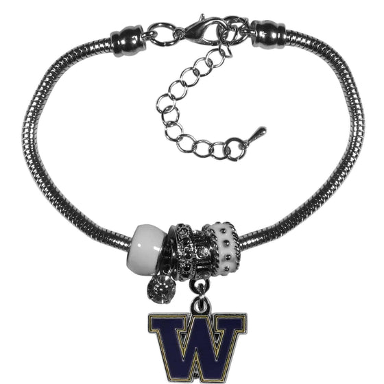 Elevate your game day experience with the Washington Huskies Euro Style Bead Bracelet, a must-have sports collectible for any true fan. This stylish 7.5-inch snake chain bracelet, complete with a 2-inch extender, features four vibrant Euro beads adorned in your favorite team colors, enhanced with dazzling rhinestone accents. The high-polish, nickel-free charm and rhinestone charm add a touch of elegance, making it the perfect way to showcase your team pride.